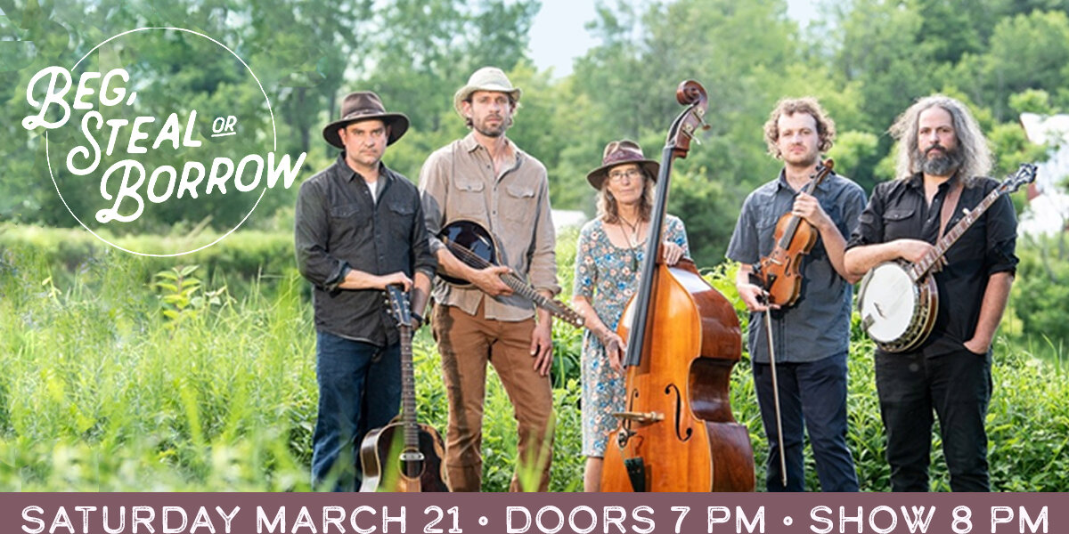 Since its formation in 2013 to celebrate the music of Old and In the Way, Beg, Steal or Borrow has appeared at venues throughout the northeast and features an ever-growing repertoire of originals and classic covers. The quintet has won bluegrass festival competitions at Podunk, Grey Fox, and Thomas Point Beach, hence being dubbed a “Triple Crown Bluegrass Band” by Bluegrass Today. The band released its debut album of original music, Old Mountain Time, in 2019, followed by and a second album, One Eye for the Sun, in 2024.