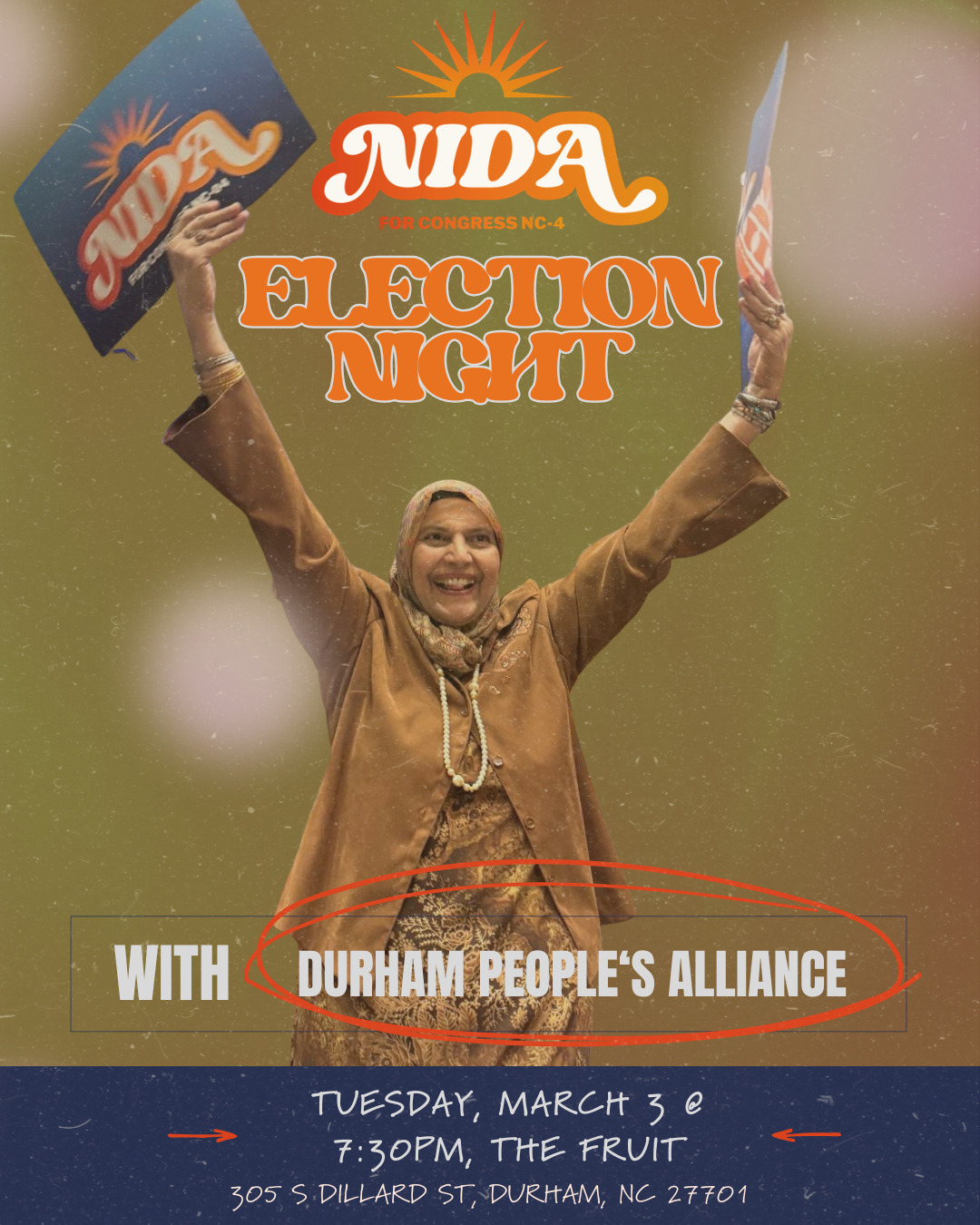 Join us on election night to watch the returns and hang out with friends new and old. DJ Gemynii will provide festive tunes, and a bar will be available. If you've never tried a watch party, it's a key element to the democratic process. Sponsored by Nida for Congress with Durham People's Alliance. The event is free; tickets are not needed. Park along Ramseur St or in the new county garage on S Dillard behind the Maizon Apartments just off South Main at Dillard.