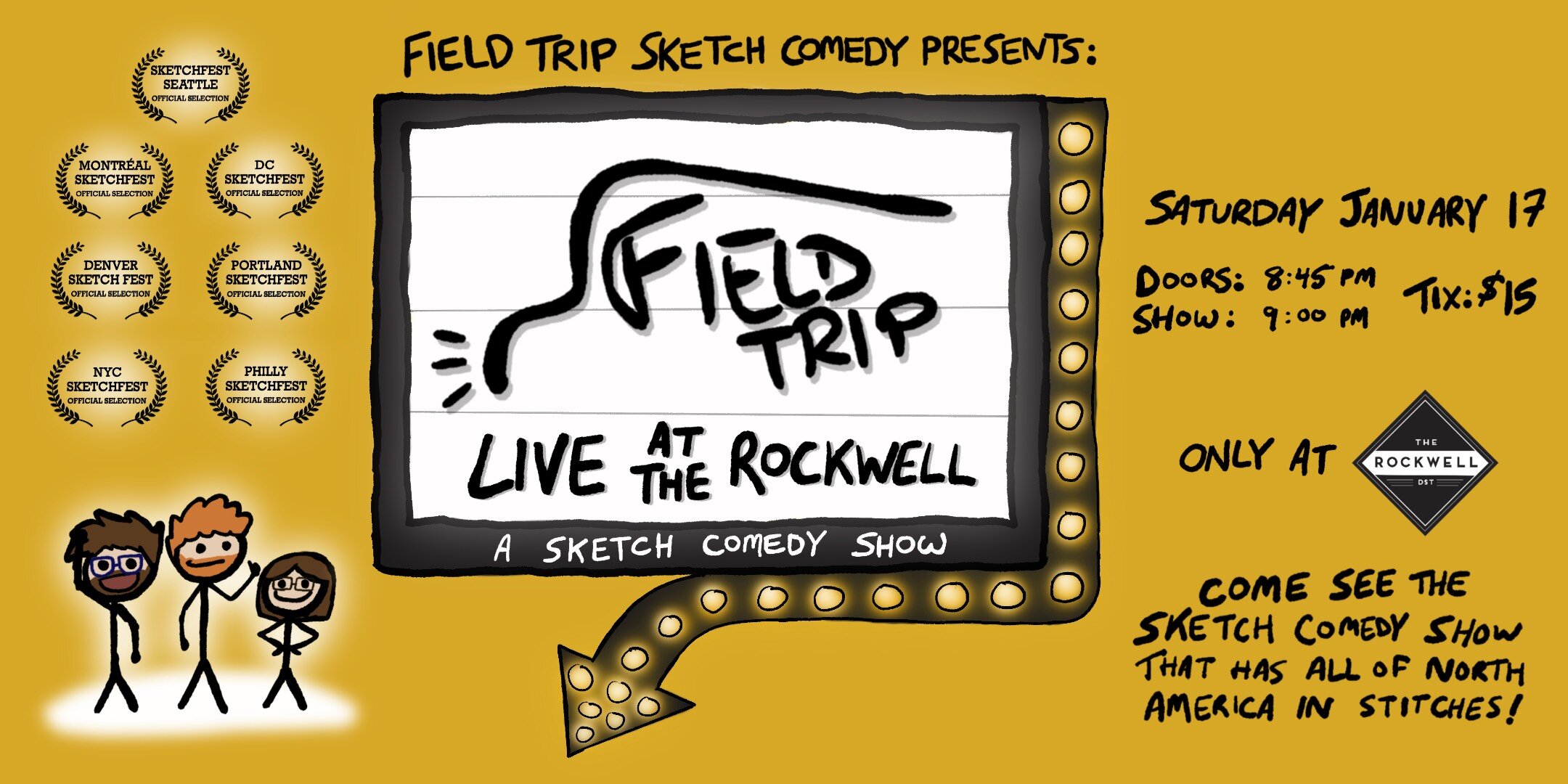 Critically panned sketch comedy trio Field Trip makes their Rockwell debut withField Trip: Live at the Rockwell, a nonstop joke parade featuring all their greatest hits. Since 2022, Field Trip has delighted audiences across America with their signature so-dumb-it’s-smart humor, and now they’re putting together the best of the best for your laughing pleasure.