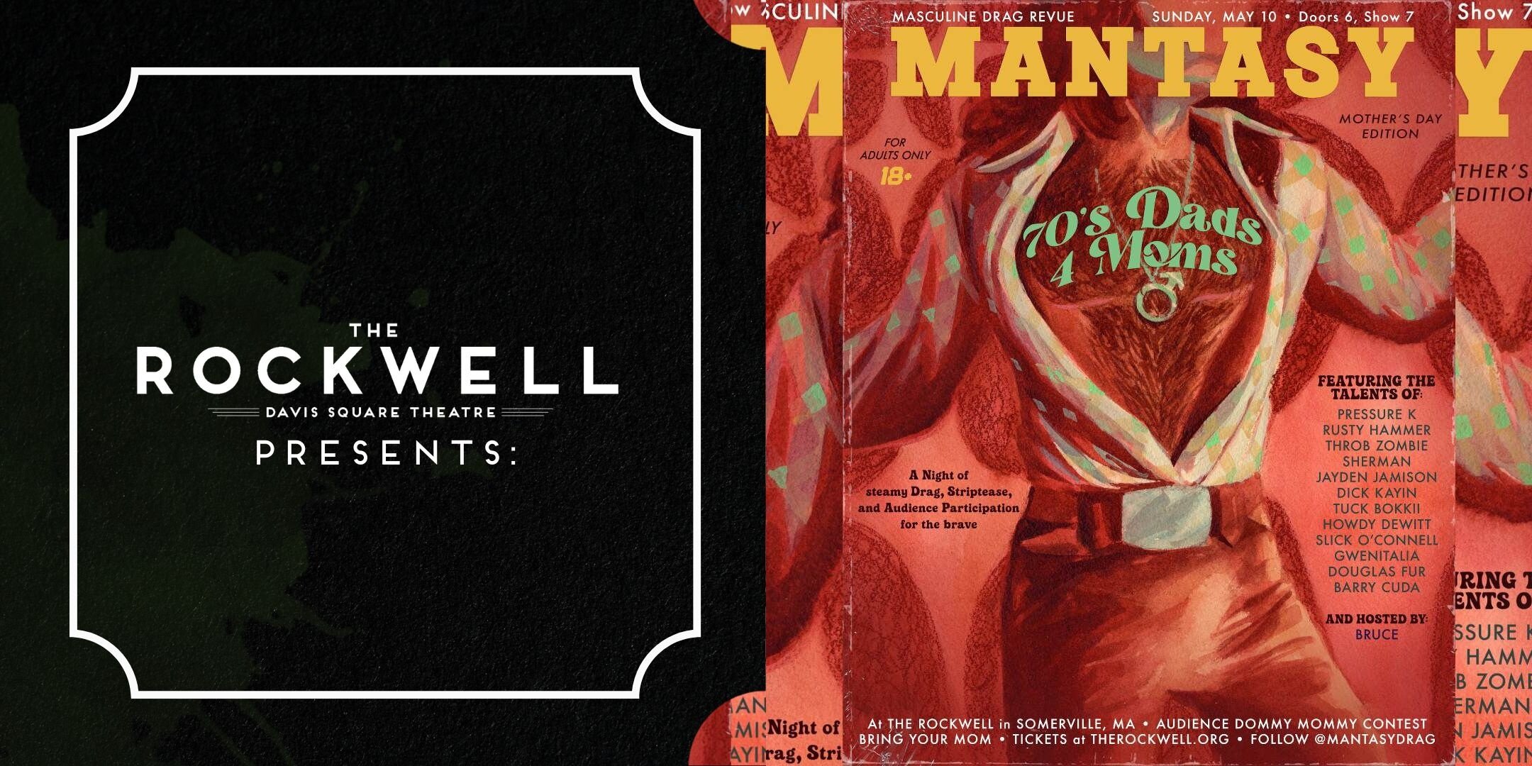 Get ready to fall in love with a very groovy Mother's Day edition of MANTASY, the masculine drag revue featuring New England’s hottest drag kings. Bringing you a sexy immersive cabaret experience of music, theatre, drag, camp, striptease; this time set to an all-70's soundtrack of hot and hairy 70's DADS FOR MOMS! Bring your moms, and bring yourself if you're a mom looking for a manly, drag filled night out. Featuring plenty of steamy audience participation, and the far-out talent of: