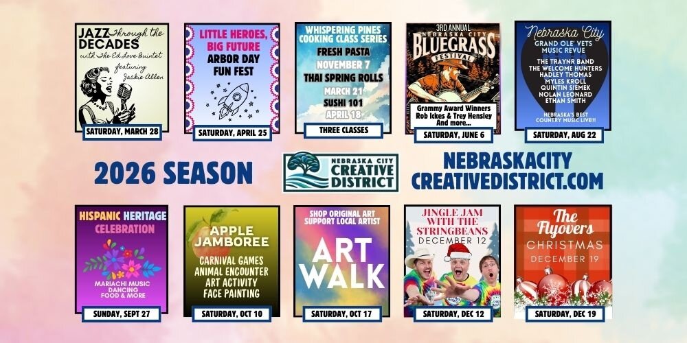 The 2026 Nebraska City Creative District is here. Get your bundled Season Passes that include all of our shows, as well as options to save on the Culinary Classes, as well as Dinner add-ons. Jump on this deal before it's too late!