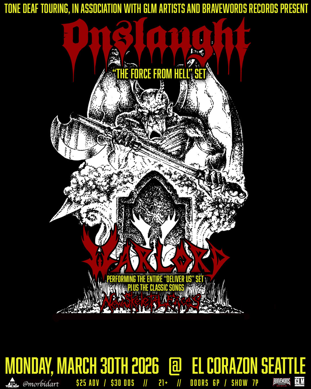 OG UK Metal Legends ONSLAUGHT are hitting North American soil for the first time in well over a decade performing their "The Force From Hell" set. It's the perfect amalgamation of their 2 seminal albums The Force and Power From Hell and they've brought back classic era vocalist Sy Keeler for this very special tour. Despite being based in Los Angeles, cult metal heroes WARLORD have never played North America over their 40-year career span and are co headlining this tour, playing their seminal album, Deliver Us in its entirety plus more classic era material. The two bands embark on this tour de force and they will be joined by New Skeletal Faces as the opening act. Get your tickets now!