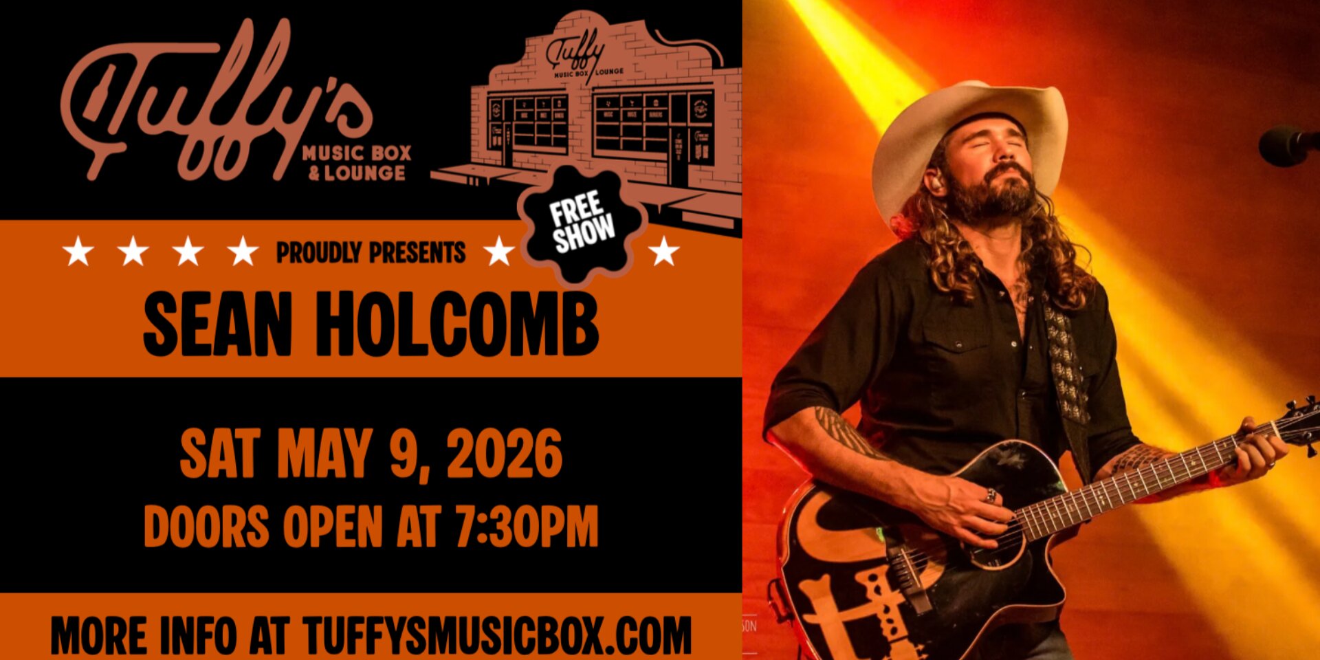 Florida native, National recording artist, and former cowboy. Sean Holcomb, brings soulful songwriting, heart-tingling vocals, foot-stomping guitar, irresistible personality and head-turning stage presence together in one delightfully authentic, package.