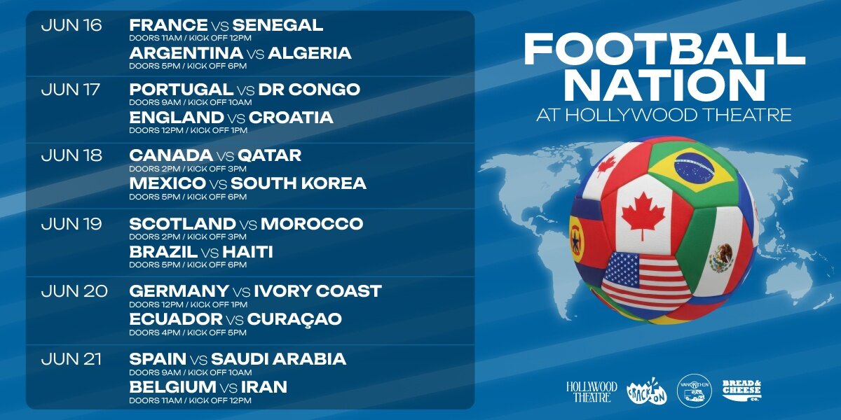 Join us at Hollywood Theatre as we bring the world’s most celebrated sport to the big screen. Watch the greatest nations compete for glory in a cinematic viewing of The Beautiful Game, surrounded by passionate fans, cold drinks and an electric atmosphere.