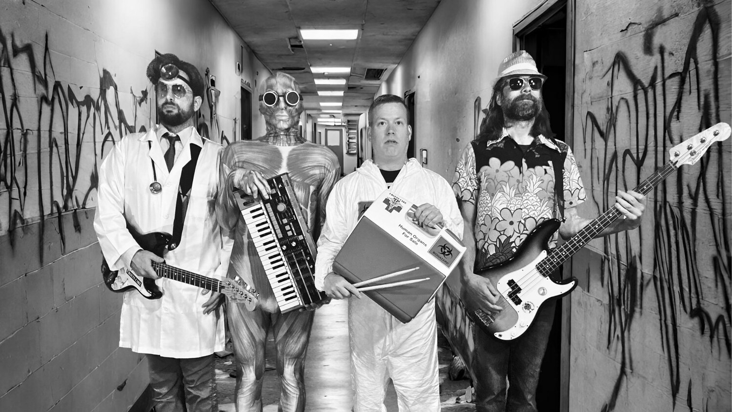 Urgent Care are Cleveland's healthcore pioneers, playing fast and dirty with both medical and musical instruments. Fast Medicine –their debut album from 2023– was hailed as “a 14-track back alley lobotomy of snarling, snotty punk rock and roll” by Upstarter.com, and has since taken the [My]charts by storm. With song topics ranging from antibiotic resistance to frostbite, the band elevates what could become trite schtick into clever and infectious earworms. A close listen reveals something undeniably genuine beneath the snarky surface, but always their core mission is good times and loud riffs. At their live shows, it is not uncommon to experience the “wheel of diagnosis,” witness a laboratory accident, or see a band member brought back to life with defibrillators. All the while, their garage punk calamity speeds forth like a fusillade of sharps disposal bins hurled from the upper atmosphere.