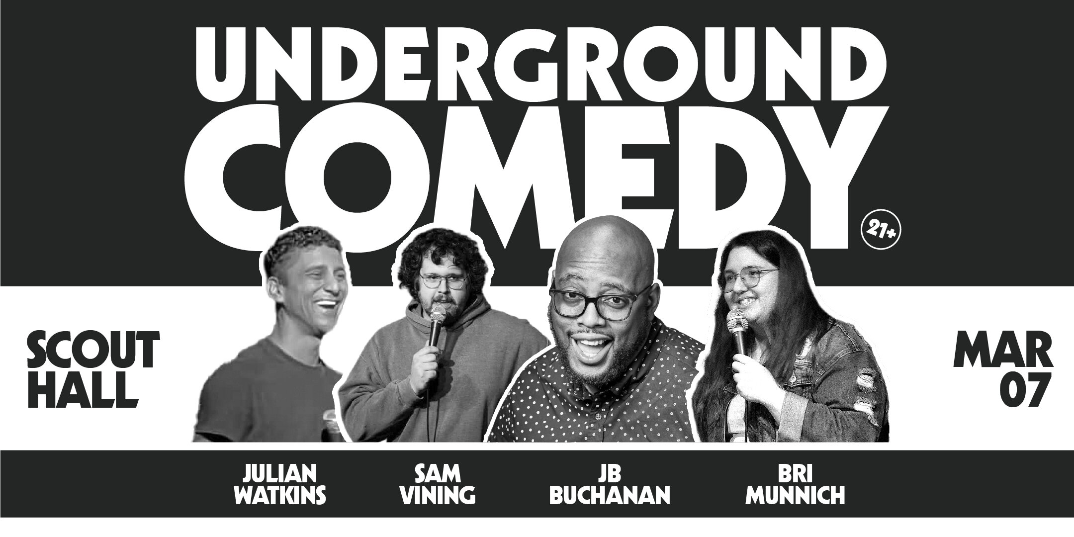Underground Comedy IS BACK on Saturday, March 07! Featuring JB Buchanan, Sam Vining, Bri Munnich and your host Julian Watkins.